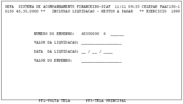 No SIAF a implantação de um novo Órgão da Administração Direta, de Outros Poderes ou da Administração Indireta (Autarquias, Fundações, Órgão de Regime Especial e Fundos) não necessita de qualquer providência especial, pois os dados com valores acumulados dos Órgãos/Entidades que não fazem parte do SIAF, são regularmente introduzidos no sistema pela SEFA/DICON. A única exigência é a de que a implantação ocorra no inicio do exercício, quando suas despesas e receitas estão incluídas na Lei do Orçamento. Para a inclusão de um Órgão e/ou uma Entidade no sistema, que não atenda este requisito, foi desenvolvida no SIAF uma rotina, que permite e facilita a sua implantação em qualquer época do ano. O acesso a esta rotina está na Tela Principal do SIAF, na opção "Implantação das Indiretas FAA.C000": ![]()