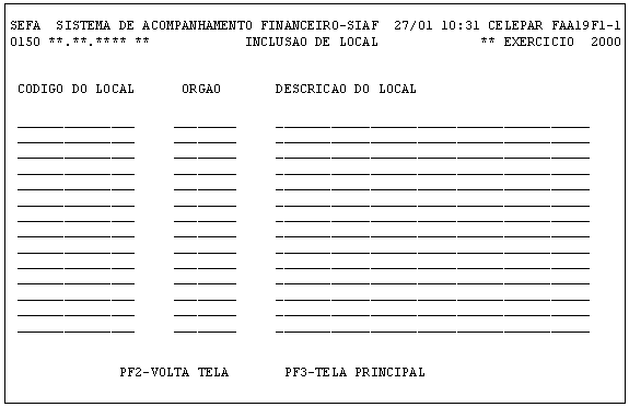O acesso no sistema à Tabela de Locais de Malote é pela Tela Principal do SIAF, na opção "Gestão de Aplicativos FAA.0000", selecionando na seqüência as opções: "Manutenção Geral do SIAF FAA.1000", Manutenção de Tabelas FAA.1900", "Locais de Malote FAA.19F0": ![]() ![]() ![]() ![]() ![]() [ Anterior ] [ Próximo ] [ Glossário ] |