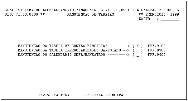 Na tela seguinte indicar "Manutenção da Tabela de Contas Bancárias FPF.9100"