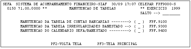 Na Tela de Programação Financeira escolher a opção "Manutenção de Tabelas FPF.9000", em seguida clicar a opção "Manutenção da Tabela de Irregularidades Banestado FPF.9300".