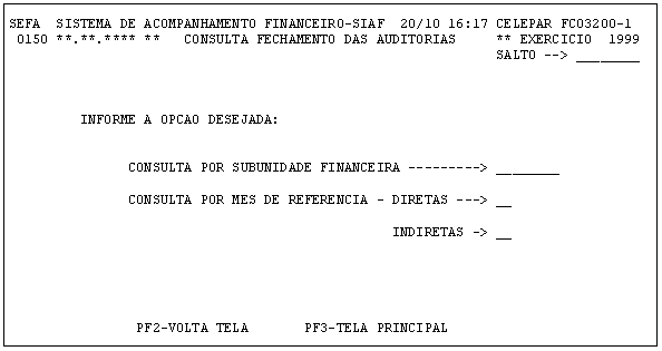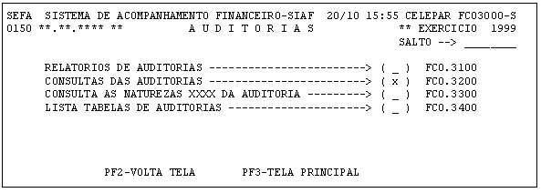 O acesso à Auditoria Contábil começa na opção "Contabilidade FCO.000" da Tela Principal do SIAF. Em seguida selecionar a opção "Auditoria FCO.3000".